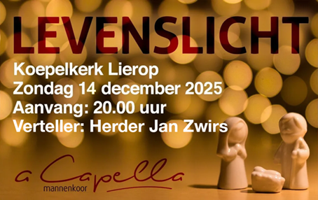 Zondagavond 14 december 2025, aanvang 20.00 uur, presenteert Mannenkoor a Capella de tweede editie van Levenslicht. Een uniek eigentijds Kerstconcert met verrassende solisten binnen het
